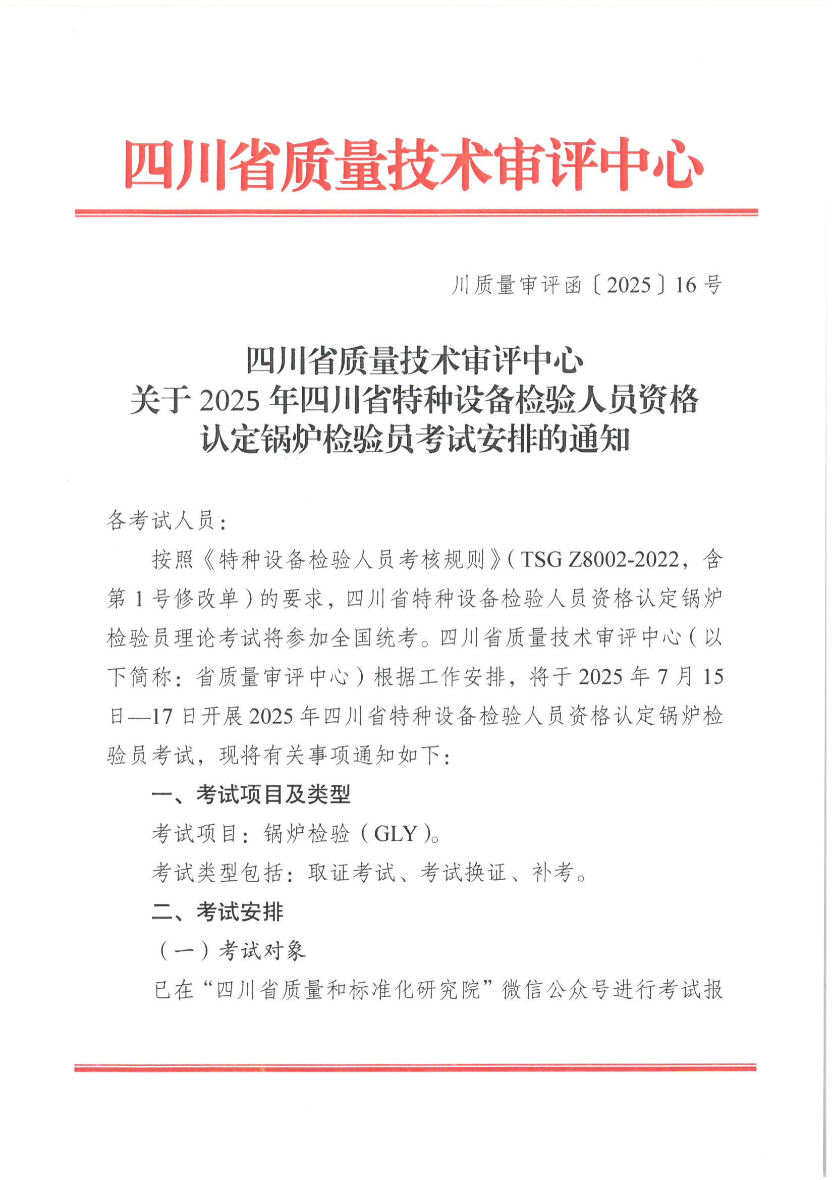 四川省質(zhì)量技術(shù)審評(píng)中心關(guān)于2025年四川省特種設(shè)備檢驗(yàn)人員資格認(rèn)定鍋爐檢驗(yàn)員考試安排的通知