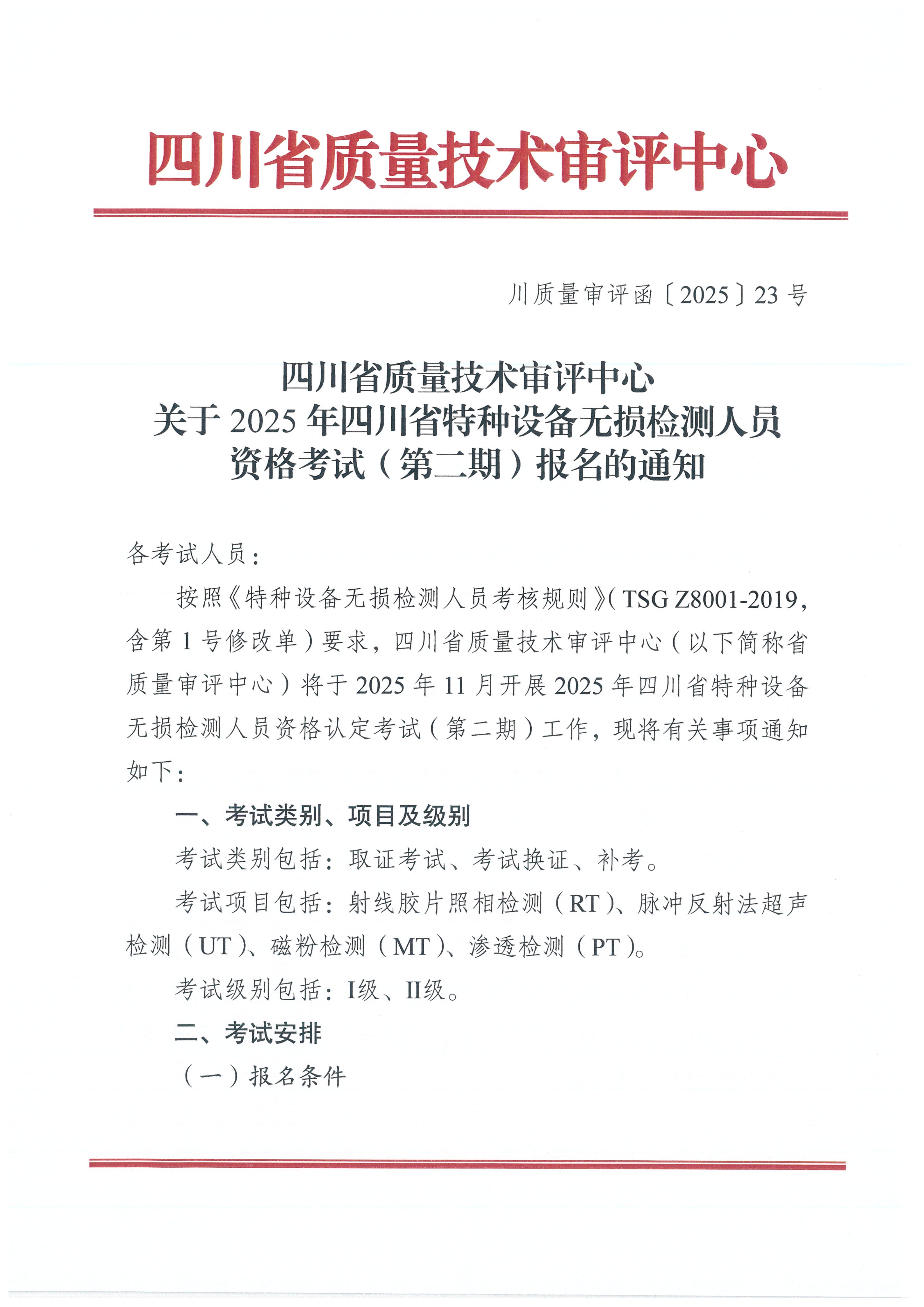 四川省質(zhì)量技術(shù)審評中心關(guān)于2025年四川省特種設(shè)備無損檢測人員資格考試第二期安排的通知