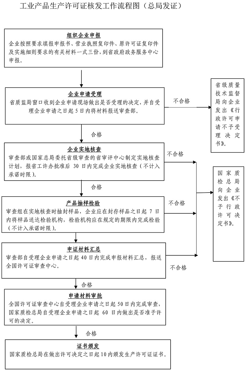 4、國(guó)家質(zhì)檢總局自受理企業(yè)申請(qǐng)之日起60日內(nèi)作出是否準(zhǔn)予許可的決定。符合發(fā)證條件的,國(guó)家質(zhì)檢總局應(yīng)當(dāng)在作出許可決定之日起10內(nèi)頒發(fā)生產(chǎn)許可證;不符合發(fā)證條件的,應(yīng)當(dāng)自作出決定之日起10日內(nèi)向企業(yè)發(fā)出《不予行政許可決定書(shū)》。