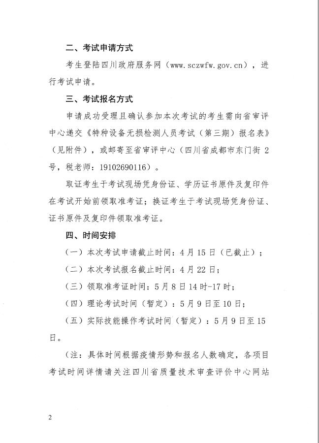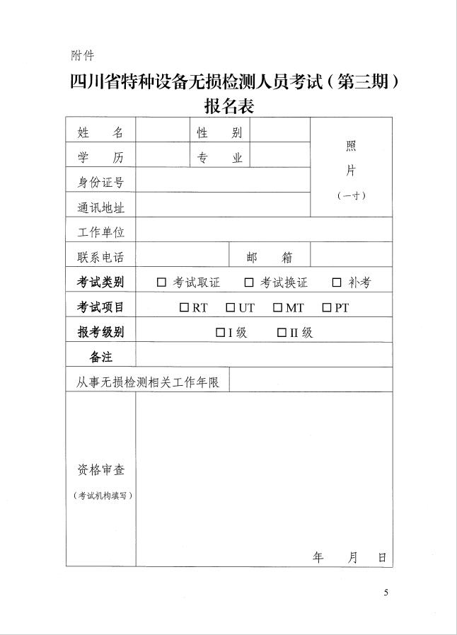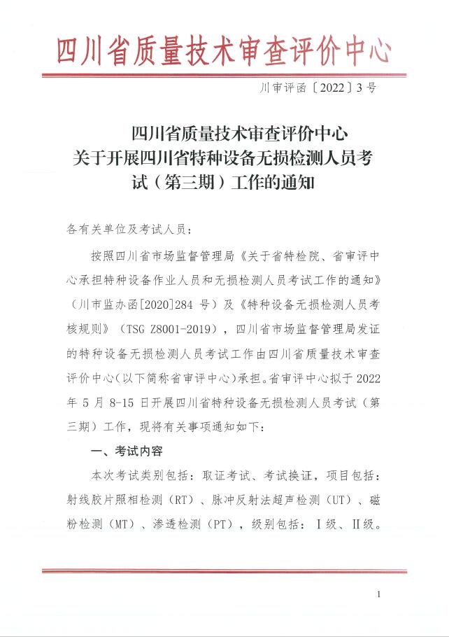 川審評(píng)函(2022)3號(hào):關(guān)于開展特種設(shè)備無損檢測人員考試(第三期)工作的通知 |