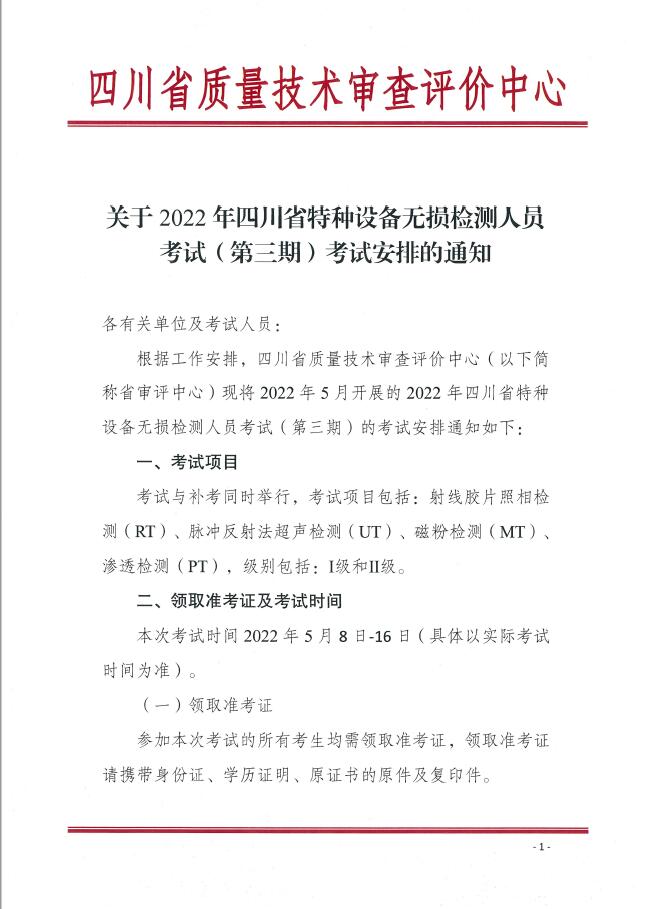 關于2022年四川省特種設備無損檢測人員考試(第三期)考試安排的通知