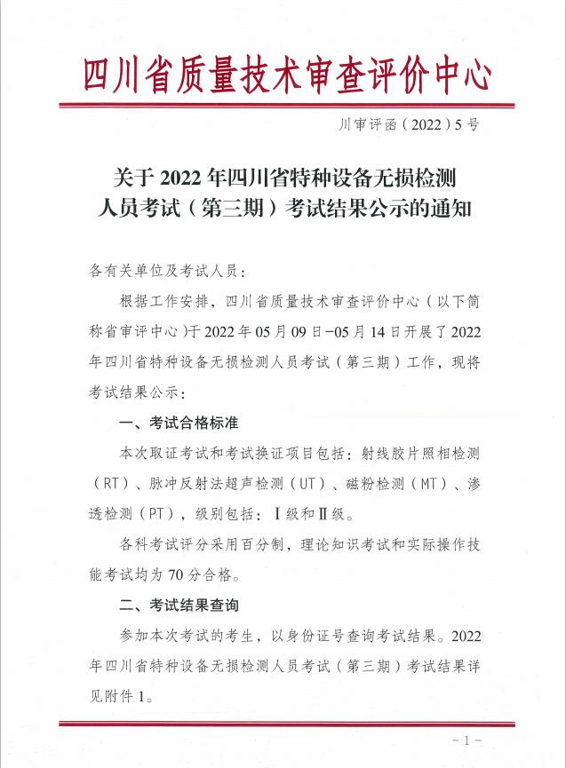 關(guān)于2022年四川省特種設(shè)備無損檢測人員考試(第三期)考試結(jié)果公示的通知