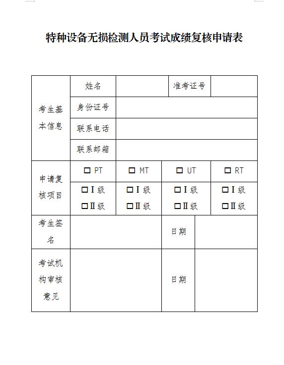 特種設(shè)備無(wú)損檢測(cè)人員考試成績(jī)復(fù)核申請(qǐng)表