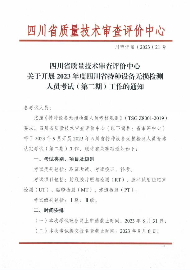 川審評函(2023)21號:關(guān)于開展2023年度四川省特種設(shè)備無損檢測人員考試(第二期)工作的通知