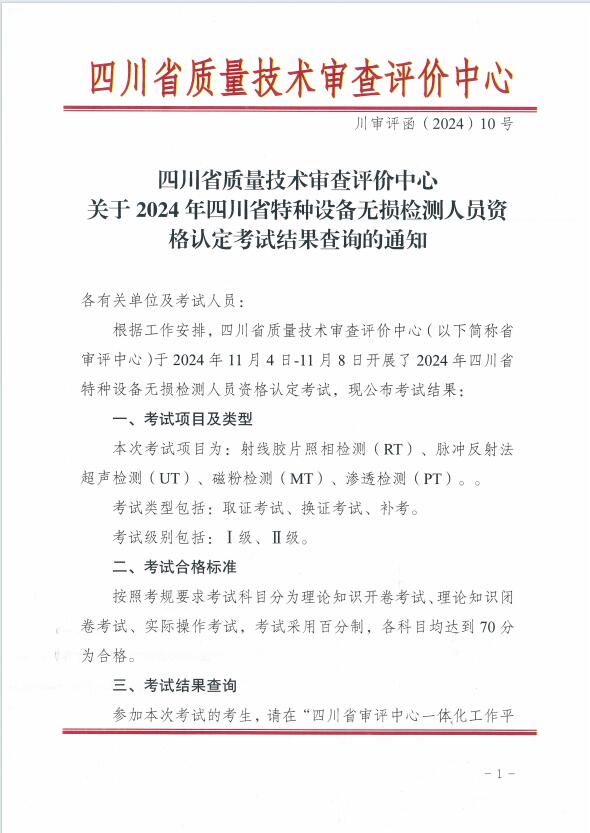 關于2024年四川省特種設備無損檢測人員資格認定考試結果查詢的通知