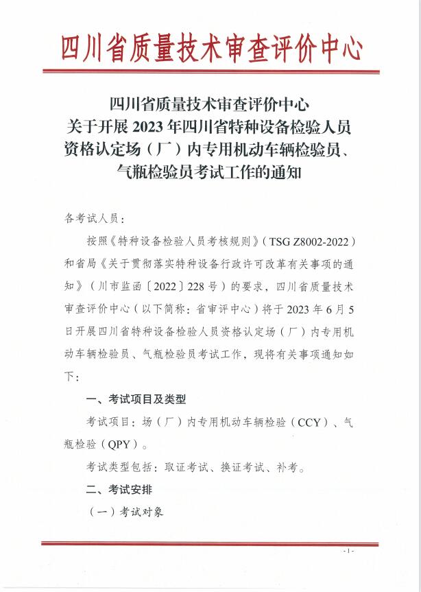 關于開展2023年四川省特種設備檢驗人員資格認定場(廠)內專用機動車輛檢驗員、氣瓶檢驗員考試工作的通知
