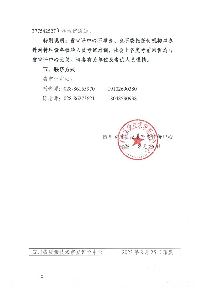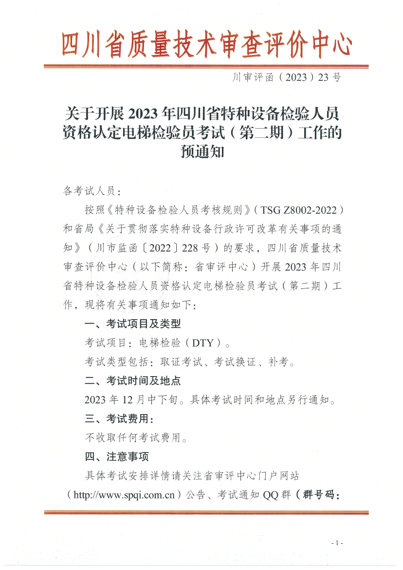 關(guān)于開(kāi)展2023年四川省特種設(shè)備檢驗(yàn)人員資格認(rèn)定電梯檢驗(yàn)員考試(第二期)工作的預(yù)通知
