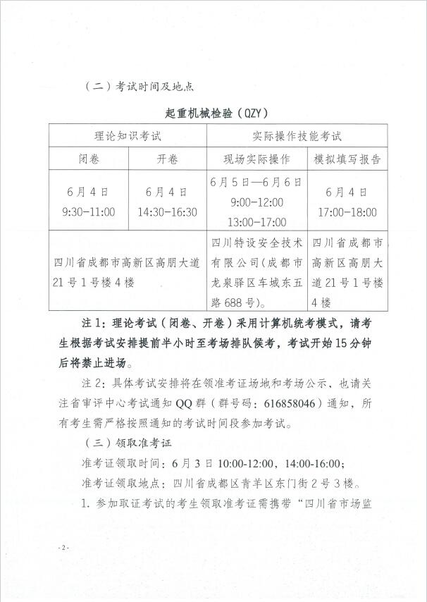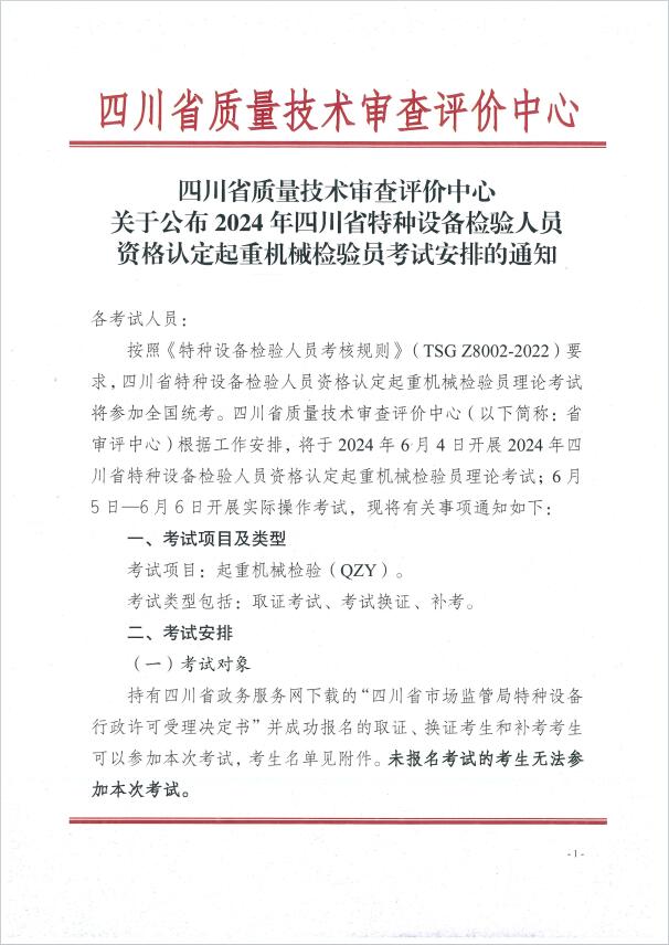 關(guān)于公布2024年四川省特種設(shè)備檢驗(yàn)人員資格認(rèn)定起重機(jī)械檢驗(yàn)員考試安排的通知
