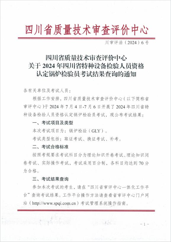 川審評函(2024)6號:關于2024年四川省特種設備檢驗人員資格認定鍋爐檢驗員考試結(jié)果查詢的通知