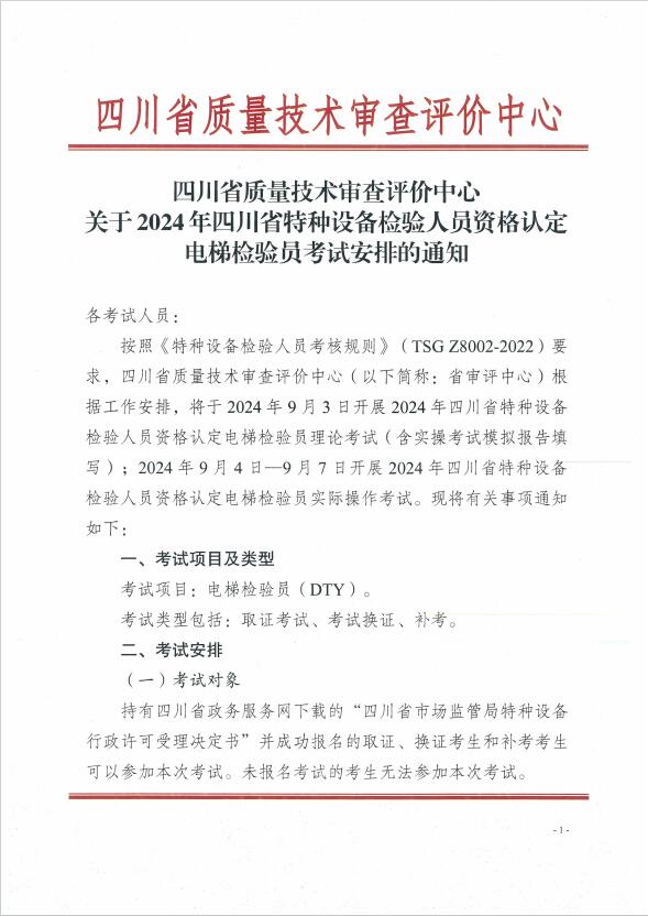 關(guān)于2024年四川省特種設(shè)備檢驗(yàn)人員資格認(rèn)定電梯檢驗(yàn)員考試安排的通知